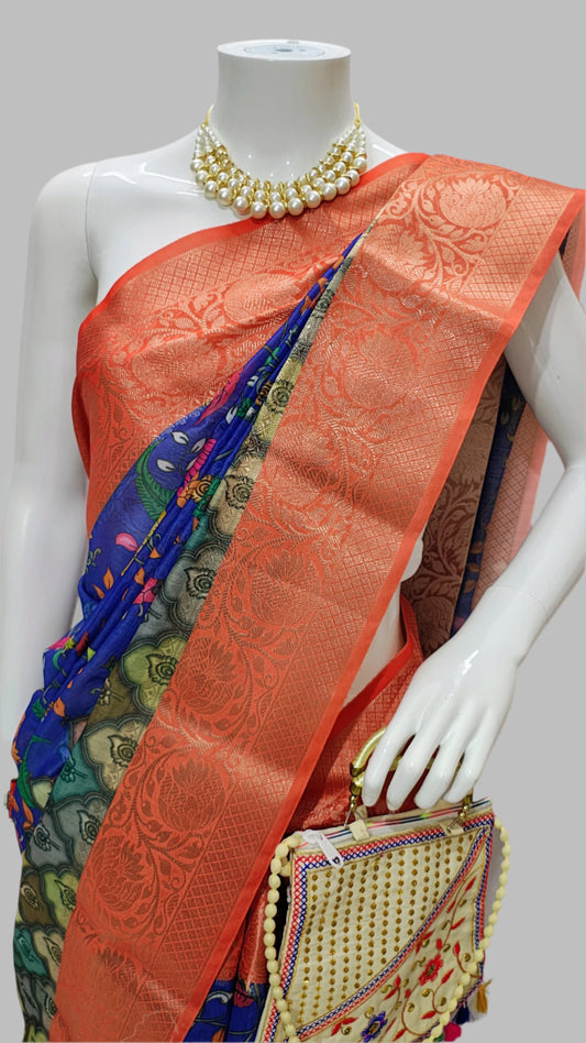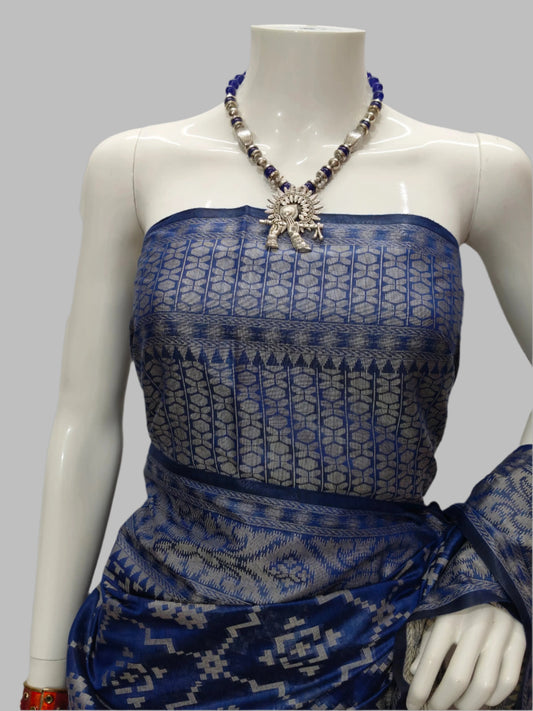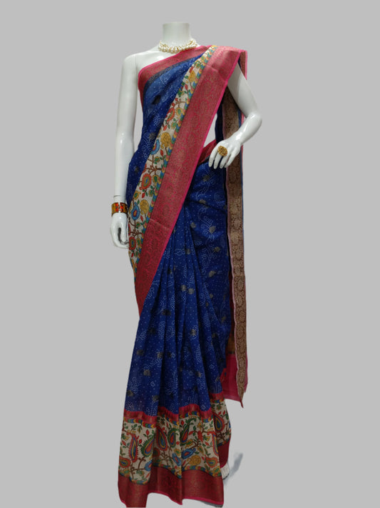 Chanderi Cotton Digital Print Blue Banarasi Saree With Unstitched Blouse