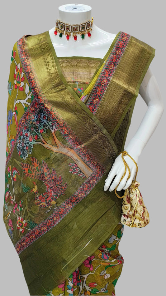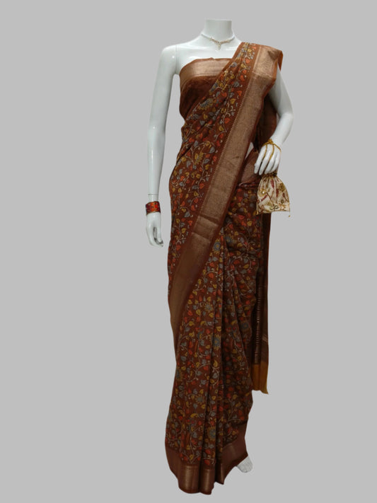 Assam Silk Kalamkari Print Brown Banarasi Saree With Unstitched Blouse
