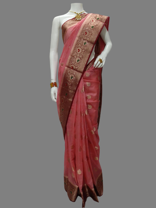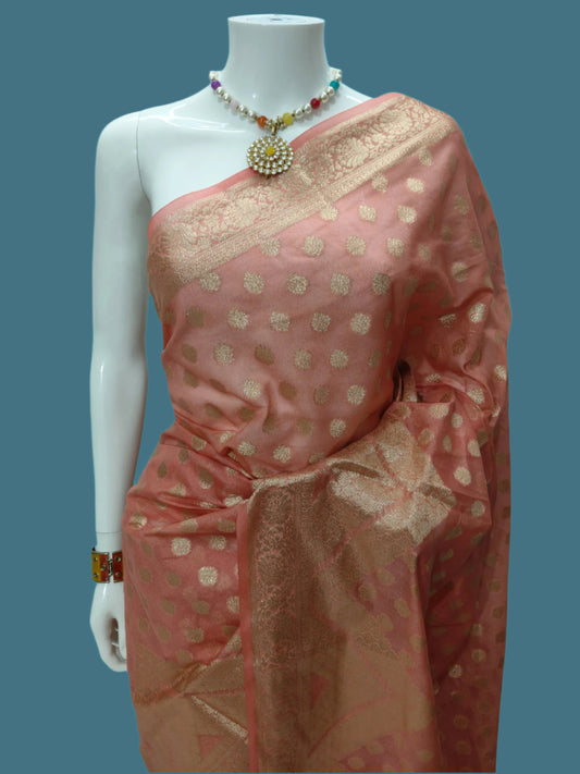 Georgette Silk Peach Color Banarasi Saree With Unstitched Blouse
