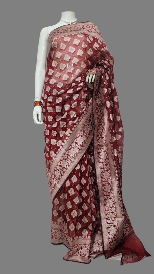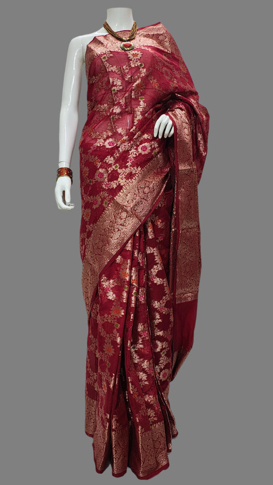Georgette Silk Meena Jal Maroon Banarasi Saree With Unstitched Blouse