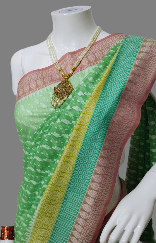 Cotton Silk Green Banarasi Saree With Unstitched Blouse